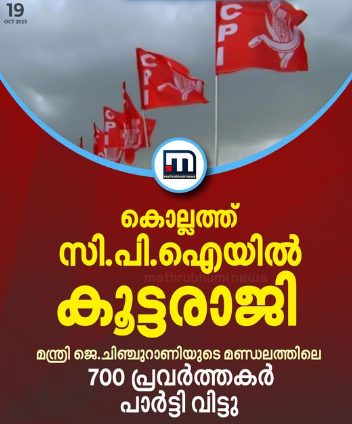 കൊല്ലത്ത് സി.പി.ഐയിൽ കൂട്ടരാജി; മന്ത്രി ജെ.ചിഞ്ചുറാണിയുടെ മണ്ഡലത്തിലെ 700 പ്രവർത്തകർ പാർട്ടി വിട്ടെന്ന് നേതാക്കൾ