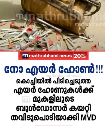 നോ എയർ ഹോൺ !!! കൊച്ചിയിൽ പിടിച്ചെടുത്ത എയർ ഹോണുകൾക്ക് മുകളിലൂടെ ബുൾഡോസർ കയറ്റി തവിടുപൊടിയാക്കി MVD