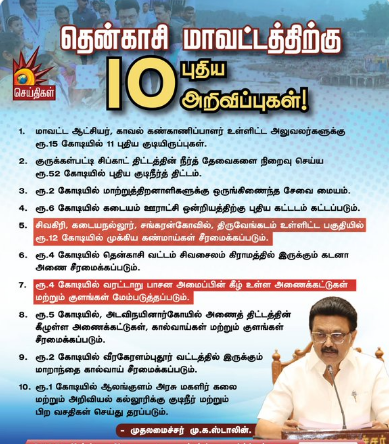 தென்காசி மாவட்டத்திற்கு 10 புதிய அறிவிப்புகள்!
