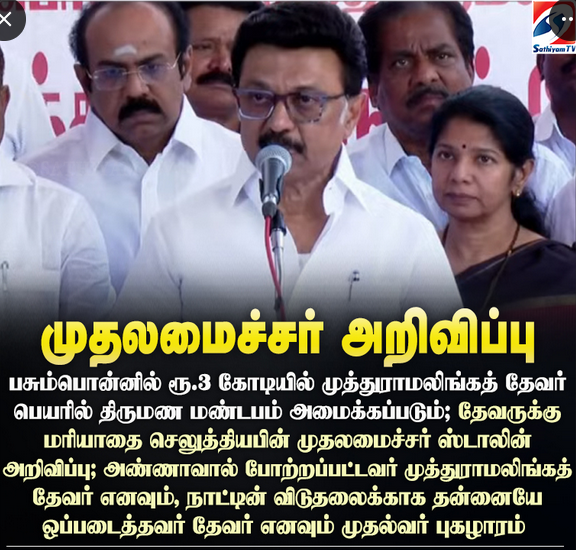 பசும்பொன்னில் ரூ.3 கோடியில் முத்துராமலிங்கத் தேவர் பெயரில் திருமண மண்டபம்; முதலமைச்சர் ஸ்டாலின் அறிவிப்பு