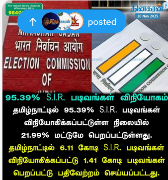 தமிழ்நாட்டில் 95.39% S.I.R. படிவங்கள் விநியோகிக்கப்பட்டுள்ள நிலையில் 21.99% மட்டுமே பெறப்பட்டுள்ளது: தேர்தல் ஆணையம்