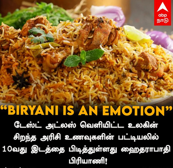 உலகின் சிறந்த அரிசி உணவுகளின் பட்டியலில் 10வது இடத்தை பிடித்துள்ளது ஹைதராபாதி பிரியாணி!