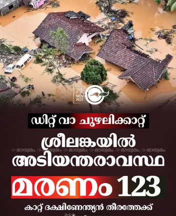 ഡിറ്റ് വാ ചുഴലിക്കാറ്റ്: ശ്രീലങ്കയിൽ അടിയന്തരാവസ്ഥ; മരണം 123 കാറ്റ് ദക്ഷിണേന്ത്യൻ തീരത്തേക്ക്