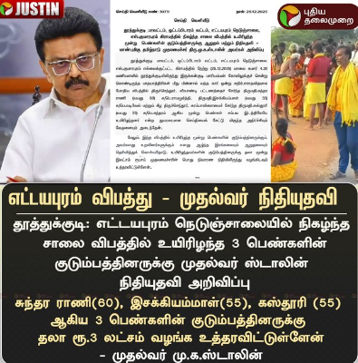எட்டயபுரம் விபத்து - முதல்வர் ஸ்டாலின் நிதியுதவி அறிவிப்பு