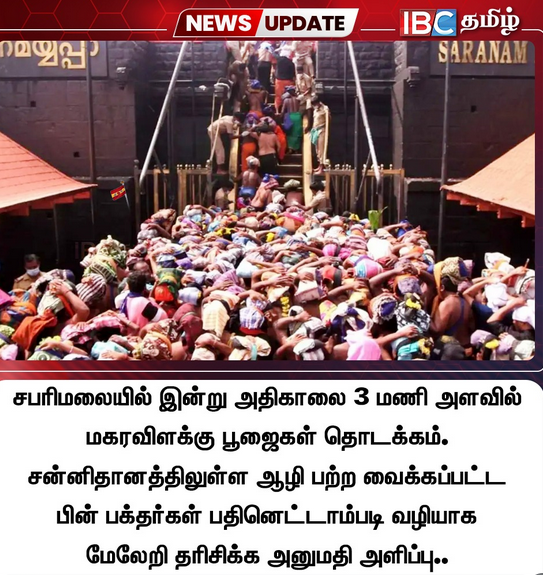 சபரிமலையில் இன்று அதிகாலை 3 மணி அளவில் மகரவிளக்கு பூஜைகள் தொடக்கம்.