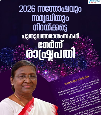 '2026 സന്തോഷവും സമൃദ്ധിയും നിറയ്ക്കട്ടെ',പുതുവത്സരാശംസകൾ നേർന്ന് രാഷ്ട്രപതി