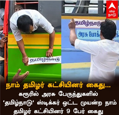 கரூரில் அரசு பேருந்துகளில் 'தமிழ்நாடு' ஸ்டிக்கர் ஒட்ட முயன்ற நாம் தமிழர் கட்சியினர் 9 பேர் கைது