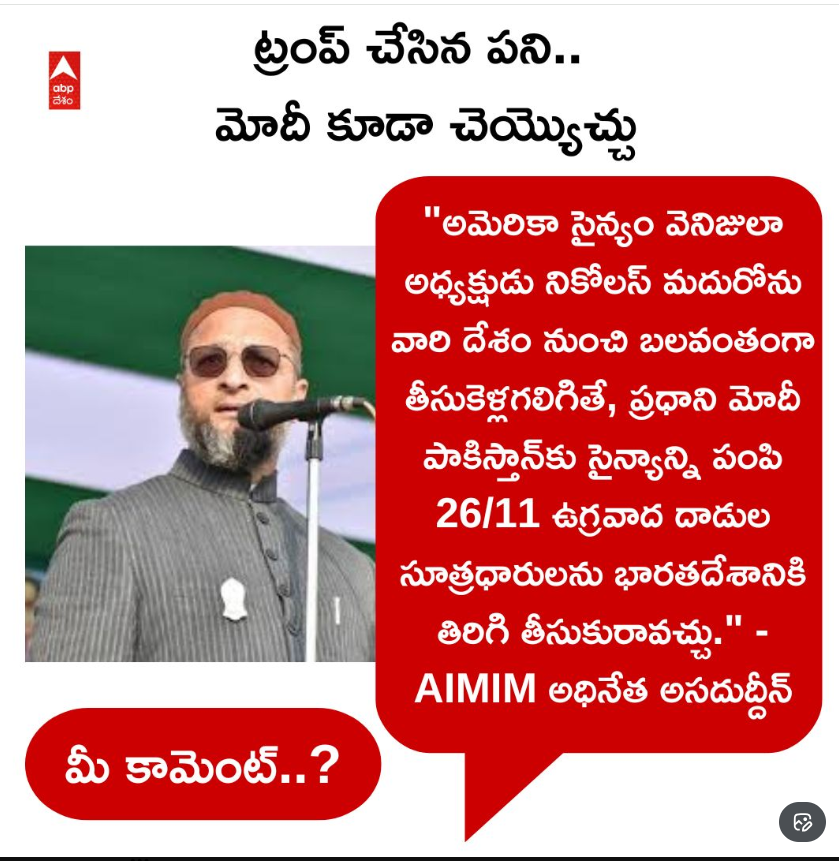 అమెరికా అధ్యక్షుడు డోనాల్డ్ ట్రంప్ సైన్యం వెనిజులా అధ్యక్షుడు నికోలస్ మదురోను వారి దేశం నుండి అపహరించి అమెరికాకు తీసుకెళ్లిందని తనకు తెలిసిందన్నారు. అమెరికా సైన్యం వెనిజులా అధ్యక్షుడు నికోలస్ మదురోను వారి దేశం నుండి బలవంతంగా తీసుకెళ్లగలిగితే, మీరు (ప్రధాని మోడీ) కూడా పాకిస్తాన్కు సైన్యాన్ని పంపి 26/11 ఉగ్రవాద దాడుల సూత్రధారులను భారతదేశానికి తిరిగి తీసుకురావచ్చు అన్నారు. అమెరికా దేశం ఏకంగా మరో దేశం అధ్యక్షుడ్ని బంధించి తీసుకెళ్లినప్పుడు, భారత్ కనీసం పొరుగు దేశం వెళ్లి ఉగ్రవాదులను ఎందుకు తీసుకురాలేకపోయిందని ప్రశ్నించారు.