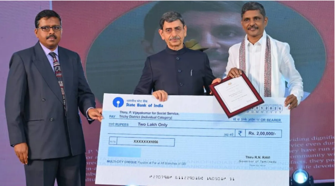 திருச்சியைச் சேர்ந்த சமூக செயற்பாட்டாளர் மற்றும் யோகா ஆசிரியர் விஜயகுமார், தனது மனைவி சித்ரா மற்றும் மகள் கீர்த்தனாவுடன் இணைந்து ஆதரவற்ற உடல்களை கண்ணியமாக நல்லடக்கம் செய்து வரும் மனிதநேய சேவைக்காக 2025-ஆம் ஆண்டின் ஆளுநர் விருதைப் பெற்றுள்ளார். சென்னை மக்கள் மாளிகை சுதந்திரப் பொன்விழா அரங்கில் நடைபெற்ற விழாவில், சமூக சேவை தனிநபர் பிரிவில் தமிழக ஆளுநர் ஆர்.என்.ரவி அவருக்கு இந்த விருதை வழங்கினார்.