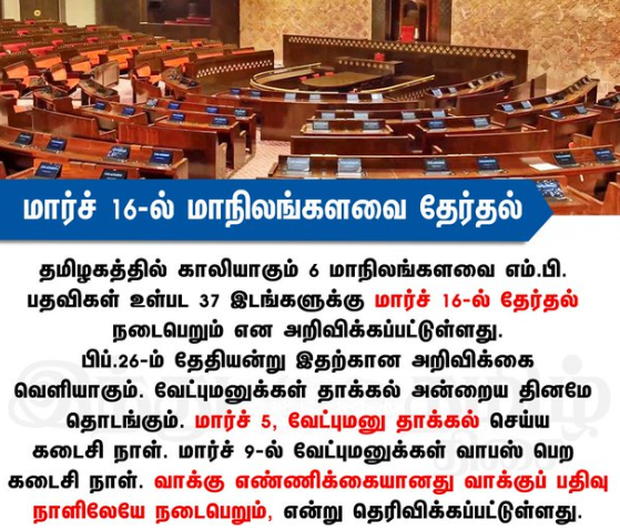 #மார்ச் 16-ல் மாநிலங்களவை தேர்தல்: தமிழகத்தில் காலியாகும் 6 இடங்கள்