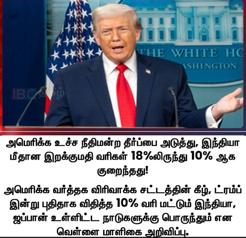 #அமெரிக்க உச்ச நீதிமன்ற தீர்ப்பை அடுத்து, இந்தியா மீதான இறக்குமதி வரிகள் 18%லிருந்து 10% ஆக குறைந்தது!