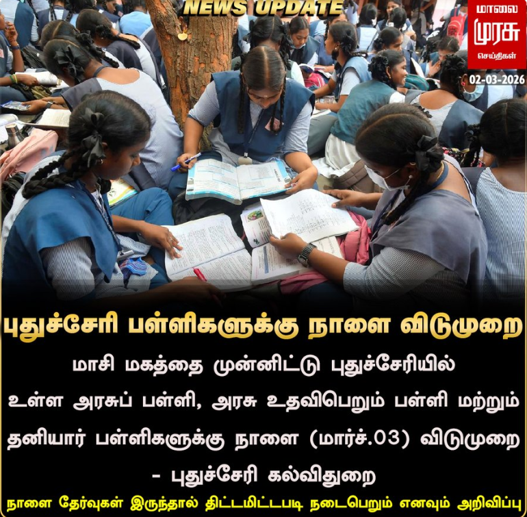 #மாசிமகத்தை ஒட்டி புதுச்சேரியில் உள்ள பள்ளிகளுக்கு நாளை விடுமுறை