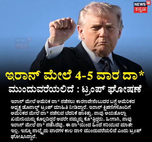 ಇರಾನ್ ಮೇಲೆ 4-5 ವಾರ ದಾ* ಮುಂದುವರೆಯಲಿದೆ : ಟ್ರಂಪ್ ಘೋಷಣೆ