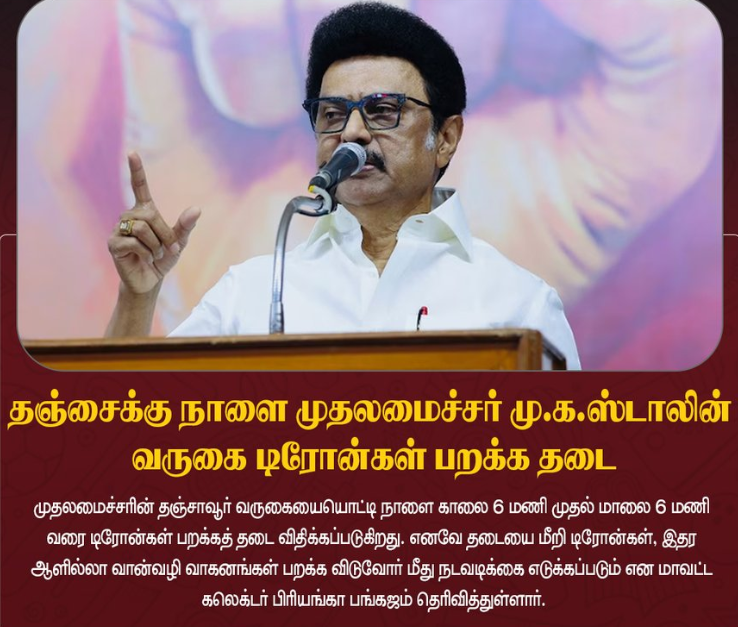 #தஞ்சைக்கு நாளை முதலமைச்சர் மு.க.ஸ்டாலின் வருகை- டிரோன்கள் பறக்க தடை