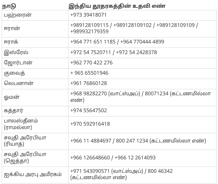 பதற்றம் நிலவும் பல்வேறு நாடுகளில் உள்ள இந்தியத் தூதரகங்களைத் தொடர்பு கொள்ள கீழ்க்கண்ட எண்கள் அறிவிக்கப்பட்டுள்ளன: