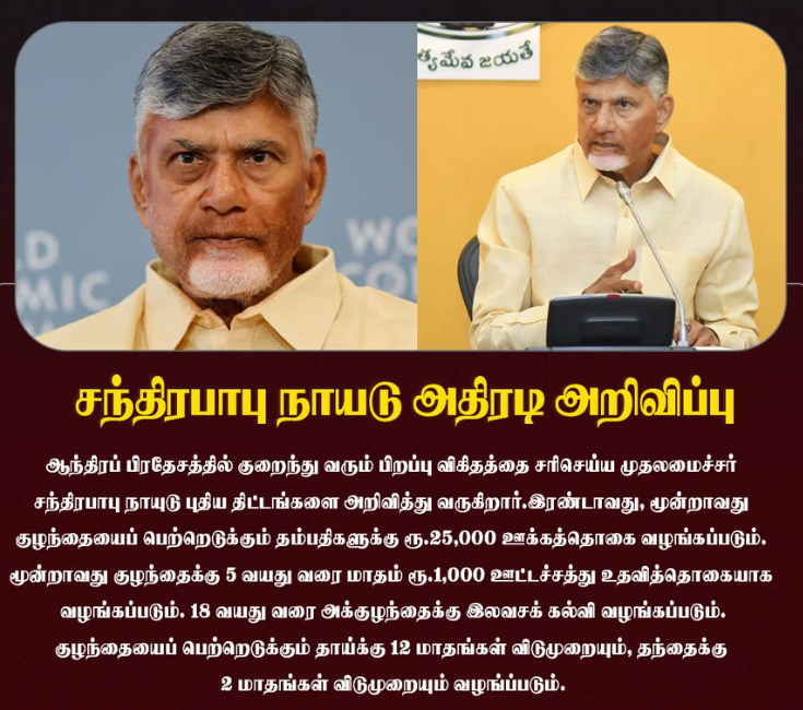 ஆந்திரப் பிரதேசத்தில் குறைந்து வரும் பிறப்பு விகிதத்தை சரிசெய்ய முதலமைச்சர் சந்திரபாபு நாயுடு புதிய திட்டங்களை அறிவித்து வருகிறார். அந்த வகையில் சட்டப்பேரவையில் 'புதிய மக்கள் தொகை மேலாண்மைக் கொள்கை' குறித்த வரைவுத் திட்டத்தை அவர் வெளியிட்டார். அதில், இரண்டாவது, மூன்றாவது குழந்தையைப் பெற்றெடுக்கும் தம்பதிகளுக்கு ரூ.25,000 ஊக்கத்தொகை வழங்கப்படும். மூன்றாவது குழந்தைக்கு 5 வயது வரை மாதம் ரூ.1,000 ஊட்டச்சத்து உதவித்தொகையாக வழங்கப்படும். 18 வயது வரை அக்குழந்தைக்கு இலவசக் கல்வி வழங்கப்படும். குழந்தையைப் பெற்றெடுக்கும் தாய்க்கு 12 மாதங்கள் விடுமுறையும், தந்தைக்கு 2 மாதங்கள் விடுமுறையும் வழங்ப்படும்.