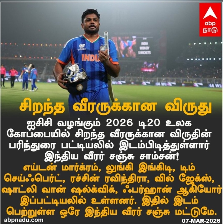 ஐசிசி வழங்கும் 2026 டி20 உலக கோப்பையில் சிறந்த வீரருக்கான விருதின் பரிந்துரை பட்டியலில் இடம்பிடித்துள்ளார் இந்திய வீரர் சஞ்சு சாம்சன்.