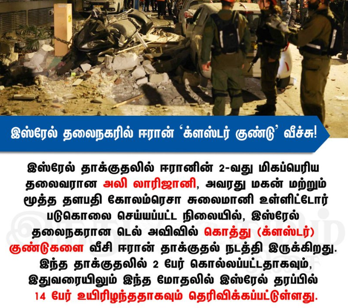 #அலி லாரிஜானி படுகொலை எதிரொலி: இஸ்ரேல் தலைநகரில் ஈரான் ‘க்ளஸ்டர் குண்டு’ வீச்சு