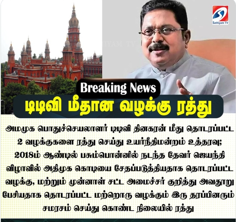 அமமுக பொதுச்செயலாளர் டிடிவி தினகரன் மீது தொடரப்பட்ட 2 வழக்குகளை ரத்து செய்து உயர்நீதிமன்றம் உத்தரவு