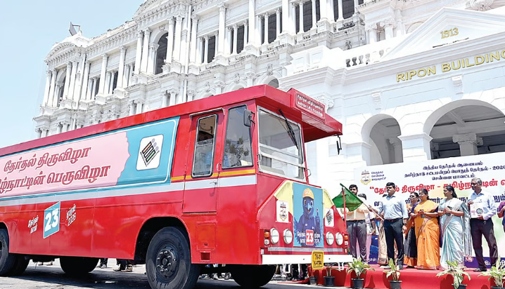 100% வாக்களிப்பதன் அவசியம் குறித்த தேர்தல் விழிப்புணர்வு கண்காட்சி பேருந்து சேவை