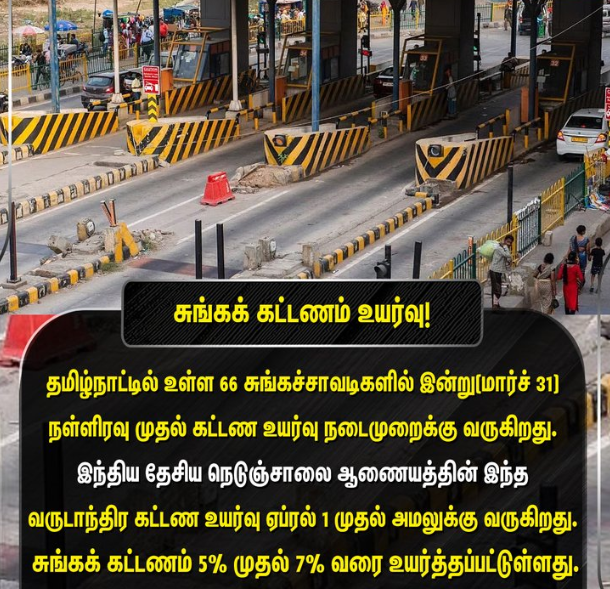 #தமிழ்நாட்டில் உள்ள 66 சுங்கச்சாவடிகளில் இன்று(மார்ச் 31) நள்ளிரவு முதல் கட்டண உயர்வு நடைமுறைக்கு வருகிறது!