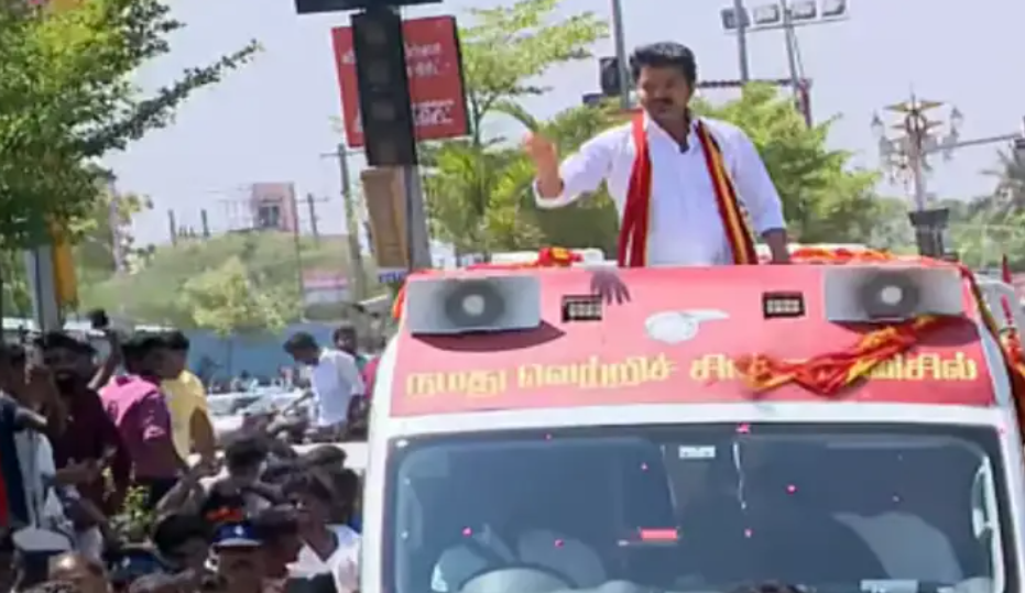 விஜய் திருச்சி விமான நிலையத்திலிருந்து பிரச்சார வாகனத்தில் மனு தாக்கல் செய்ய வந்தார் விஜய்.திருச்சி விமான நிலையத்திலிருந்து வேட்பு மனு தாக்கல் செய்யும் இடம் வரை விஜய் ரோடு ஷோ தொண்டர்கள் வீசி எரித்த கட்சி தொண்டை துண்டுகளை வாங்கி தனது தோளில் அணிந்தபடி விஜய் தொண்டர்களை நோக்கி கையைசைத்தும் வாகனத்தில் நின்றபடி வந்து கொண்டிருக்கிறார். ஏற்கனவே விஜய் செல்லும் இடங்களில் கூட்டம் அதிகமாக இருப்பதால் ஏதும் அசம்பாவிதங்கள் நடைபெறக்கூடாது என்பதால் ரோடு ஷோ போன்றவற்றை நடத்தக் கூடாது என்று தேர்தல் ஆணையம் உத்தரவு இருந்த நிலையில் திருச்சி விமான நிலையத்திலிருந்து வேட்பு மனு தாக்கல் செய்யும் இடமான 5 கிலோ மீட்டர் தொலைவு ஏராளமான காவல்துறையினர் பாதுகாப்புக்கு இருக்கும் நிலையில் விஜய் ரோடு ஷோ நடத்தியது தேர்தல் விதிகளுக்கு புறம்பாக அமையுமா? என மக்கள் கருத்து தெரிவித்துள்ளனர்.