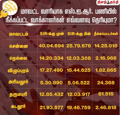 மாவட்ட வாரியாக எஸ்.ஐ.ஆர். பணியில் நீக்கப்பட்ட வாக்காளர்கள்