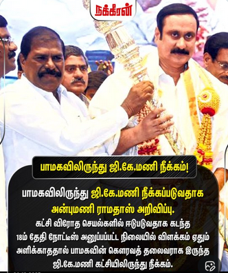 பாமகவின் கௌரவத் தலைவராக இருந்த ஜி.கே.மணி கட்சியிலிருந்து நீக்கம்.
