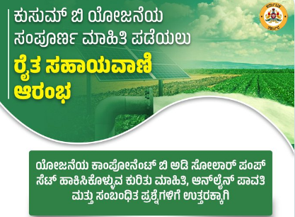 ಕುಸುಮ್ - ಬಿ ಯೋಜನೆಯಿಂದ ರೈತರು ವಂಚಿತರಾಗಬಾರದು ಮತ್ತು ಮಾಹಿತಿ ಕೊರತೆ ನೀಗಿಸಲು ಕರ್ನಾಟಕ ನವೀಕರಿಸಬಹುದಾದ ಇಂಧನ ಅಭಿವೃದ್ಧಿ ನಿಯಮಿತವು ನಾಗರಬಾವಿ ಕೇಂದ್ರ ಕಚೇರಿಯಲ್ಲಿ ಸಹಾಯವಾಣಿ ಕೇಂದ್ರ ಸ್ಥಾಪಿಸಿದೆ. ಯೋಜನೆಯ ಕಾಂಪೋನೆಂಟ್ ಬಿ ಅಡಿ ಸೋಲಾರ್ ಪಂಪ್ಸೆಟ್ ಹಾಕಿಸಿಕೊಳ್ಳುವ ಕುರಿತು ಮಾಹಿತಿ, ಆನ್ಲೈನ್ ಪಾವತಿ ಮತ್ತು ಸಂಬಂಧಿತ ಪ್ರಶ್ನೆಗಳಿಗೆ ಉತ್ತರ ಸಿಗಲಿದೆ. ರೈತರು ಮಧ್ಯವರ್ತಿಗಳನ್ನು ಸಂಪರ್ಕಿಸದೆ 080 2220 2100 ಮತ್ತು 80951 32100 ದೂರವಾಣಿ ಸಂಖ್ಯೆಗಳನ್ನು ಸಂಪರ್ಕಿಸಬಹುದು