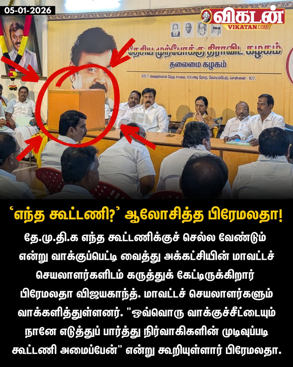 தே.மு.தி.க எந்த கூட்டணிக்குச் செல்ல வேண்டும் என்று வாக்குப்பெட்டி வைத்து அக்கட்சியின் மாவட்டச் செயலாளர்களிடம் கருத்துக் கேட்டிருக்கிறார் பிரேமலதா விஜயகாந்த்.