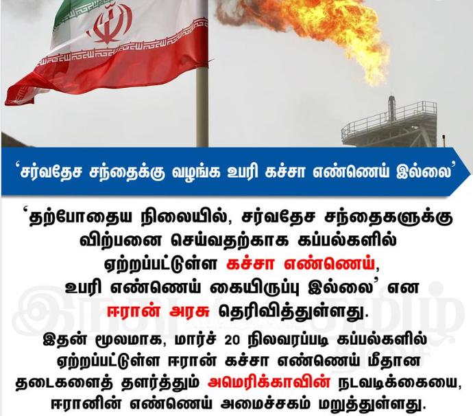 மேற்கு ஆசியப் பிராந்தியத்தில் நிலவும் மோதல் நான்காவது வாரத்தில் அடியெடுத்து வைக்கும் நிலையில், கச்சா எண்ணெய் விலை கடுமையாக உயர்ந்து, சர்வதேச எண்ணெய் எரிவாயு சந்தை ஏற்கனவே பெரும் நிலையற்ற தன்மையுடன் காணப்படுகிறது. இந்நிலையில், ஈரான் தரப்பிலிருந்து வந்துள்ள இந்த மறுப்புச் செய்தி, நிலையற்ற சந்தையில் மேலும் பதற்றத்தை ஏற்படுத்தக்கூடும். முன்னதாக, ஈரானின் கச்சா எண்ணெய் மற்றும் பெட்ரோலியப் பொருட்கள் மீதான தடைகளை, இந்த ஆண்டு ஏப்ரல் 19 வரை தற்காலிகமாகத் தளர்த்துவதாக அமெரிக்கா வெள்ளிக்கிழமை அறிவித்தது. இந்தத் தளர்வின் கீழ், ஈரான் கச்சா எண்ணெய் மற்றும் சுத்திகரிக்கப்பட்ட பெட்ரோலியப் பொருட்களை அமெரிக்காவிற்குள் விற்பனை செய்யவும் அனுமதி வழங்கப்பட்டுள்ளது. அந்த அறிக்கையின்படி, மார்ச் 20 நிலவரப்படி கப்பல்களில் ஏற்றப்பட்டுள்ள ஈரானிய கச்சா எண்ணெய் மற்றும் பெட்ரோலியப் பொருட்களை உலக நாடுகளுக்கு விநியோகிக்கவும், விற்பனை செய்யவும் அனுமதி வழங்கப்பட்டுள்ளது.