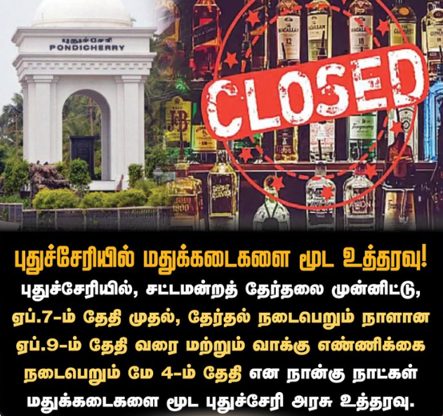 புதுச்சேரியில் மதுக்கடைகளை மூட உத்தரவு!